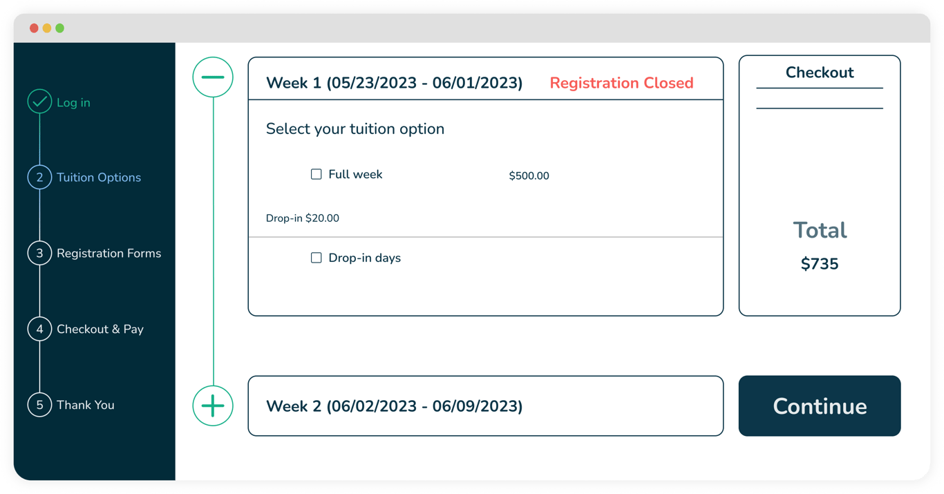 Easily create and manage camp schedules that span multiple weeks. Whether you offer half-day, full-day, daily drop-in, or overnight camps, Jumbula’s intuitive interface allows you to set up various sessions and customize them to fit even the most complex scheduling needs.