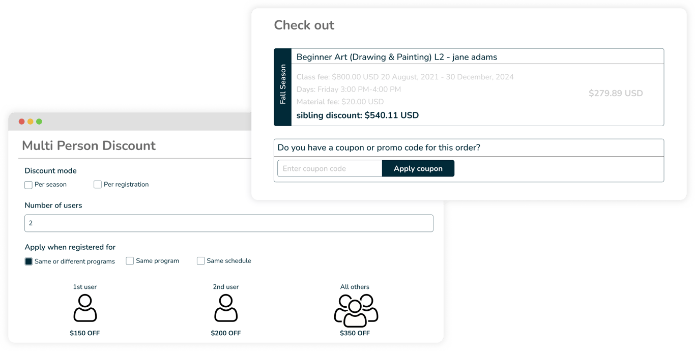 Set up and manage promotional offers, discounts and coupons for your camps with a few clicks. Create coupon codes with customizable eligibility rules, expiration dates, and percentage/fixed discounts.