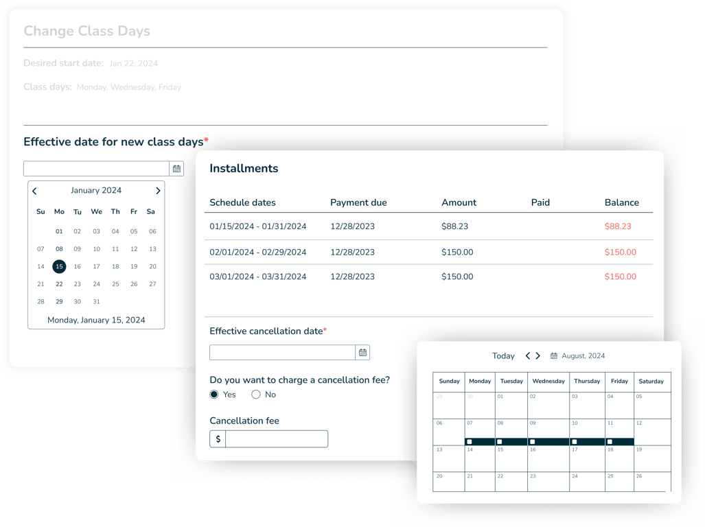 Maintain oversight while offering families flexibility with Jumbula childcare management tools. From the admin dashboard, easily edit or cancel a family's enrollment with full control over registration changes. Customizable cancellation policies allow you to charge fees to families based on notice period or other criteria you configure. Self-service options let families seamlessly shift class dates, swap sessions, or select a new start date. Automated notifications keep parents informed of changes made by administrators. Jumbula brings together administrative oversight with family self-service for the ideal childcare management experience.