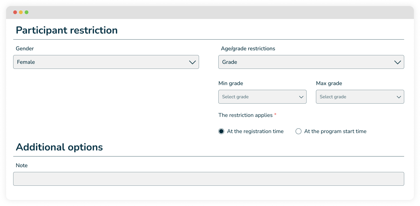 You have the flexibility to set specific age or grade-level restrictions for enrollment in each program. Jumbula’s automation accurately calculates age during registration to either allow or block signups based on your configured criteria. This allows you to tailor enrollment eligibility, whether you want to open programs for specific grade levels or restrict participation to certain age ranges.
